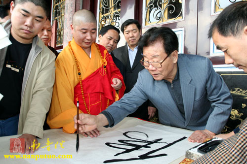 最后,李主席应众人之请在藏经阁中挥毫题下庄严的“佛”字,则悟大和尚代表我寺常住馈赠李主席观音菩萨像一尊,留下了永久的纪念。