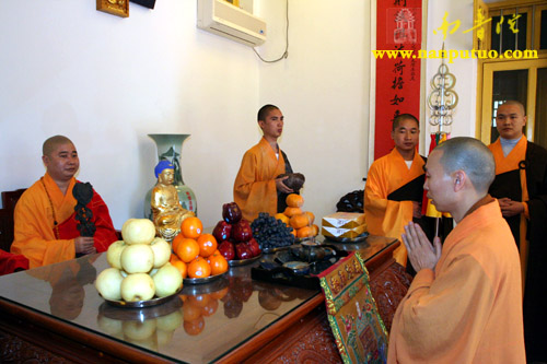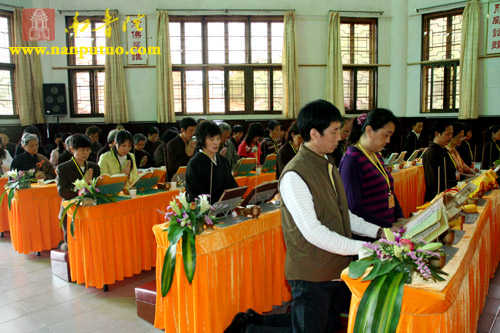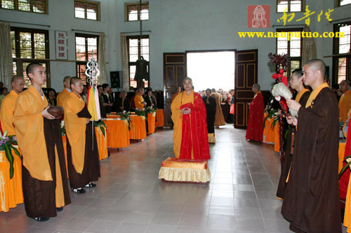 上午10时开始奉供上堂,由叶碎娥、郑建余、陈建新、陈春莲、胡智银、高胜玉六位斋主偕其全家敬设上堂斋襯一筵于五观堂供佛及僧。10时一到,钟鼓齐鸣,则悟大和尚在仪仗队的迎护下从方丈楼缓步行入大坛,维那师举腔咏赞,大和尚至佛前上香、礼佛后升座宣法,众人怀着感恩、虔诚的心,聆听大和尚的开示。诸大檀那,虔诚设斋,殷勤请法,龙天护念,既种良田,必获善种。