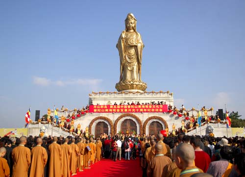 11月9日,佛教人士及嘉宾在普陀山观音大佛前参加瞻礼活动。该观音大佛高33米,建成10周年。