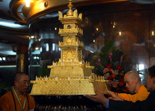 11月9日,佛教人士摆放释迦如来真身舍利塔。