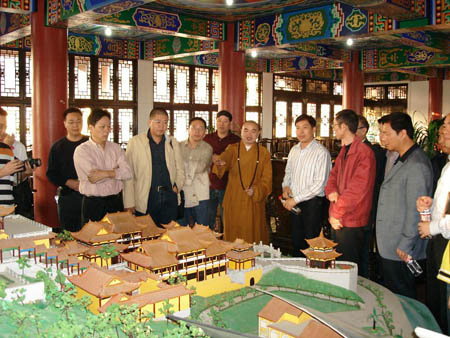 芳振法师陪同视察团参观了中普陀寺建设情况,并详细介绍了寺院建设规模及工程进度情况。