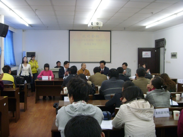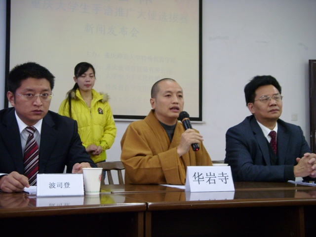 道坚法师在会上表示,以后华岩文教基金会的重点发展方向将是针对残疾人士,现场宣布华岩文教基金会将在高校设立 “残疾人华岩奖学金”项目。并表示以后华岩寺的禅修、夏令营等活动今后将逐步倾向残疾人。为了换起更多的人士对残疾人的关心和帮助,“华岩手语”培训班将以万人计划为目标,现已培训2期(近400人),同时在华岩寺、重庆大学城、西南大学设置培训点,第三期即将开班,详情尽请关注本站。并预祝本次大赛圆满成功。