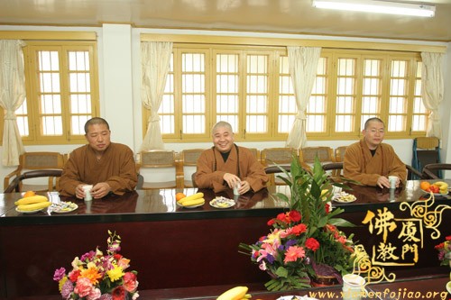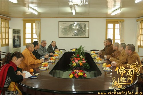 座谈会上,双方在办学培养佛教人才、对台交往等方面进行了交流。则悟大和尚介绍了厦门与台湾省具有悠久的历史,举行两岸四地祈福大法会;每年与金门、澎湖为世界和平而举行的水陆空大法会;派护法团护佛指舍利赴台供奉等等与台湾同胞更加增进了了解,结下深厚的法谊。在新的一年里将提升对台的交往工作,促进社会和谐、发挥佛教的积极作用。
