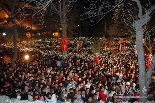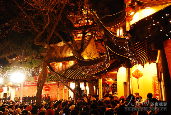 年年相继寒山寺,岁岁聆听吉祥钟。2007年12月31号晚,姑苏城外,古刹江苏省苏州市寒山寺在漫天灿烂的礼花中,隆重举行寒山寺第二十九届辞旧迎新听钟声活动。 夜半时分,寒山寺的钟声又一次响起,陪伴人们迎来了2008年的元旦。