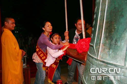二十三点四十二分,智法师宣布撞钟仪式开始,第一响清脆的吉祥钟声,划破中国最高端的夜空,开始迎新奥运年的到来。接着第二响、第三响、第四响钟声接连敲响。