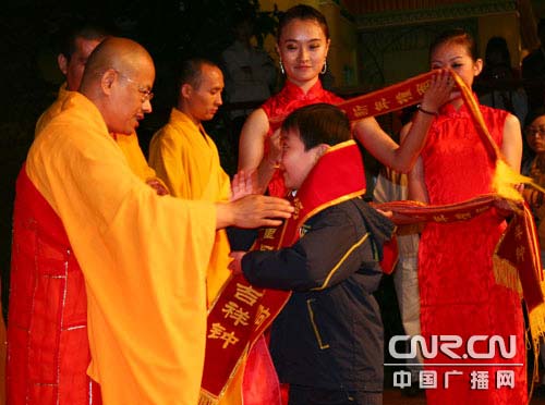 当晚七点半,主题为“南海圆融山,祝福奥运年”的迎新晚会在南山休闲会馆拉开祈福活动。南山艺术团的禅乐佛舞,尤其是“千手观音”赢得现场观众的阵阵掌声。接着,南山寺当家法师智法率10多名僧众为108名信众和游客举行佩戴撞钟授带仪式。在仪式中,智法师讲解了撞钟的意义:“佛教认为人有一百零八种烦恼,钟声敲打一百零八响,人听之后便可以排忧解愁。108响钟声代表了人们祈求时时平安的愿望。有一句佛偈说的好:闻钟声,烦恼轻,智慧长,菩提生,离地狱,出火坑。”每条绶带都标明钟响的序号,从第一排到第一百零八。