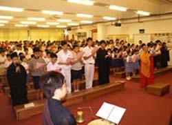 与会的同学在满可法师的带领下,一面唱诵《悉发菩提心》,一面礼拜文殊菩萨,希望借著菩萨的力量增长福慧,满可法师及诸位法师亲自赠送每位学生一份精美的结缘品。除此之外,满可法师也透过譬喻经的故事,叮咛佛光孩子在学习的阶段,日常生活应用心听、专心学、不妄语、时时为别人着想、处处为社会服务。同学们在诸位法师们的祈福下,人人法喜充满,对未来充满希望。