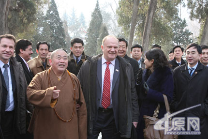 瑞雪过后,昨日的郑州阳光明媚,空气清新。在皑皑白雪的映衬下,掩映在苍松翠柏之中的少林寺显得格外幽静而神秘。上午10时,这座千年古刹迎来了一位贵宾——俄罗斯联邦共产党主席久加诺夫。省委常委、市委书记王文超,市委常委、市委秘书长杨丽萍,市委常委、统战部部长、副市长胡荃陪同参观。