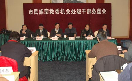 为更好地学习党的十七大精神,落实中央和上海市委的各项指示要求,切实做好2008年上海民族宗教工作,2008年1月5日至6日,上海市民族宗教委召开全委处级干部务虚会。市委领导、各处室正副处长、正副调研员、处长助理参加了会议。