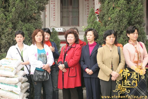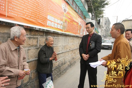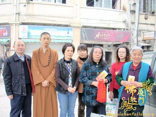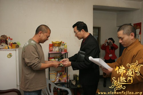 此次慈善捐赠活动有计划、有步骤、周到的进行,黄诚局长、向协法师带领走访开元街道;传航法师带领走访鹭江街道;传本法师带领走访虎溪社区;佛慧法师、广念法师带领走访滨海街道;道平法师、上勤法师带领走访厦港街道;正辉法师、隆泉法师带领走访梧村街道。捐赠对象:思明区贫困家庭135户,每户一袋大米、400元生活补助。