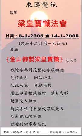 2008年1月8日至14日,香港东莲觉苑启建梁皇宝忏法会,此次法会礼诵《金山御制梁皇宝忏》七永日,欢迎各界共沾法喜。