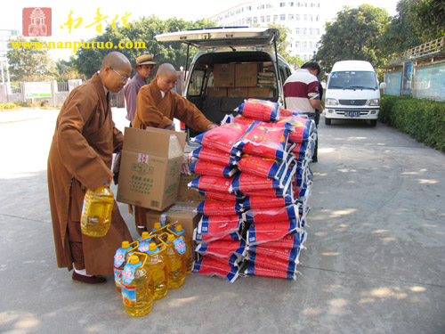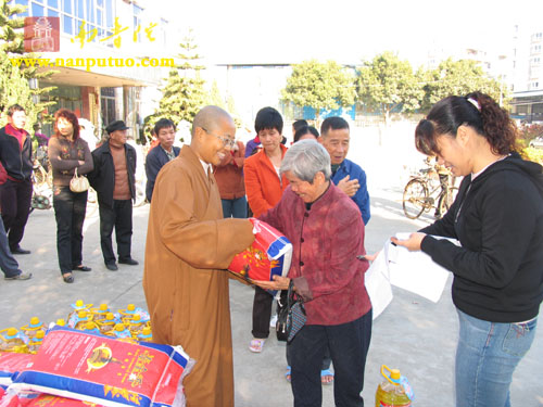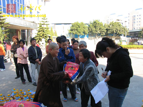元月20日下午,受会长圣辉大和尚嘱托,普陀法师、通灵法师、静仁法师一行来到厦门市思明区滨海街道慰问贫困居民,为那里的74户贫困家庭带去了1万余元的大米和食用油,并为20户特困户送去了1万元的慰问金,祝福他们过一个欢喜、祥和、快乐的春节。贫困居民们看到本会赠送的高级泰国香米和葵花籽油,脸上露出了久违的笑容。