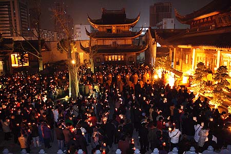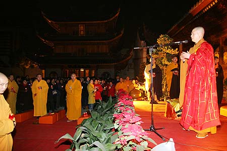 九时三十分,“传灯法会”在缈缈梵呗声中拉开序幕。先依佛教传统仪规,诵经祈福。主法可祥法师在大众齐诵“南无本师释迦牟尼佛”圣号中开始传灯,佛光由台上蔓延到台下,每一位参与者将手中的烛光传给身旁的人,然后灯灯相传。点点烛光,交辉呼应,幽暗的广场顿时变成光的海洋,一时天上人间。在传递心灯时,大家相互寄语“平安吉祥”、“合家安康”……祈祷国泰民安、世界和平。接着,大家手棒“心灯”,一起颂唱“燃灯之歌”。