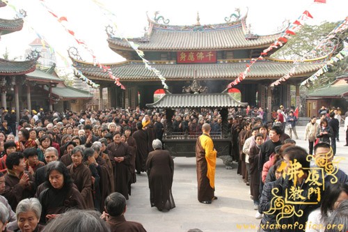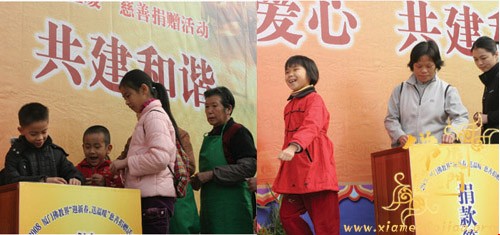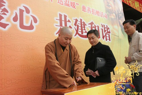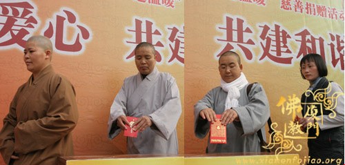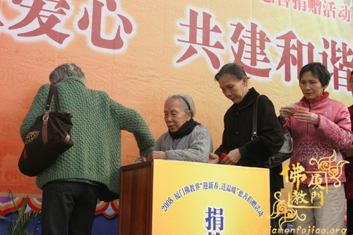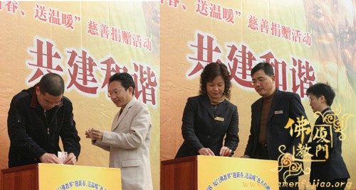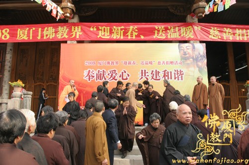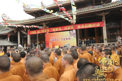厦门佛教界已经连续三年举行新春捐赠活动,引导广大信众爱心互助,营造和谐温暖的厦门佛教气氛,受到社会一致好评。所得善款,全部捐献给特困家庭、孤老孤儿,把大家的一片爱心传递给他们,让他们过上快乐祥和的新年。奉献爱心,共建和谐厦门、和谐社会。