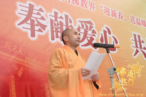 一年一度的新春佳节到来之际,厦门市佛教协会本着佛教的慈悲济世精神,组织厦门佛教界的广大僧俗,在南普陀寺热情、隆重的举行了“2008厦门佛教界‘迎新春、送温暖’慈善捐赠活动”。 活动由南普陀慈善会正兴法师主持。