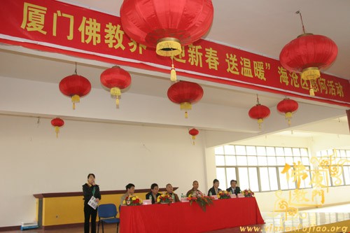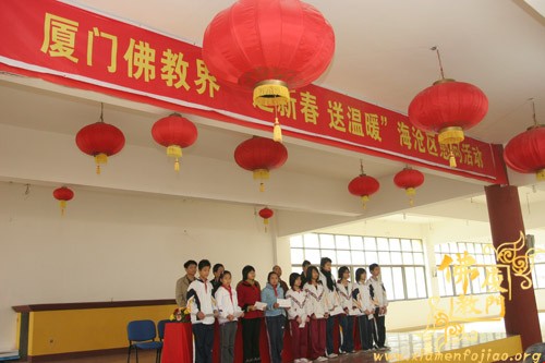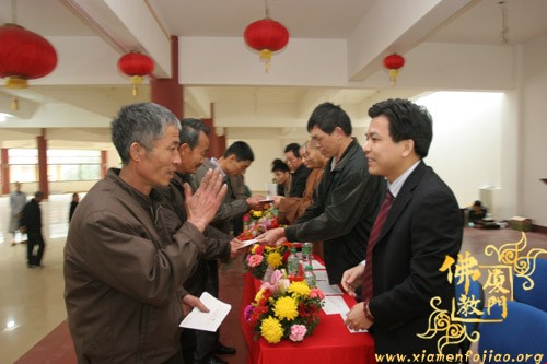 本次慰问活动是厦门市佛教协会送来的5万元善款,是2008年厦门佛教界迎新春、送温暖慈善捐款活动所筹集的一部份,此次受助范围是海沧区的弱势群体共100户,受助代表学生及贫困家庭怀着感恩的心,有次序的到台上领取慰问善款各500元。