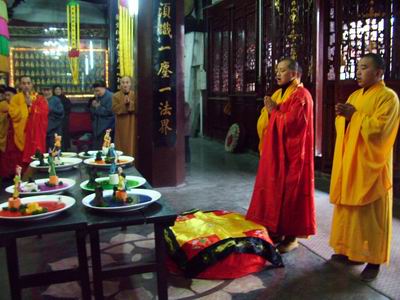 上午8点半,华岩寺方丈道坚法师率四众弟子数百名在大雄宝殿举行祈福法会。祈祷来年世界和平,国泰民安,愿十方善众如意吉祥,增福增慧,诸佛圣众欢喜庇护。