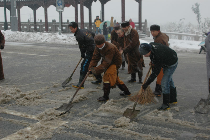 2月1日夜间的大雪再次将苏州的各个主干道淹没,为了过往车辆的行驶安全,苏州北塔报恩寺的常住法师,顶着凛冽的寒风和冰冷的雪花,在冰雪中用铁锹敲铲,用扫帚推扫,一寸一寸地前行,认真地清理着积雪和路面的冰冻。中华佛教的文化内核就强调爱国爱教、利乐有情、慈心向人、同体大悲,无论出家还是在家,作为苏州市里的一份子,当城市和市民的生命和安全受到威胁时,就因该挺身而出。此时的天空,雪花仍然在飘落,大家的头上、衣服被融化的雪花浸湿了,雪水和汗水混合在一起,但是谁也顾不上去擦一把,此刻,法师们都紧握着铁铲,以自己的实际行动来响应党中央、国务院的号召,用自己满腔的热情抗击着风雪;经过几个小时的奋战,苏州平门桥附近的积雪被清扫干净,地上没有冰冻、没有积雪,路面也不再打滑。