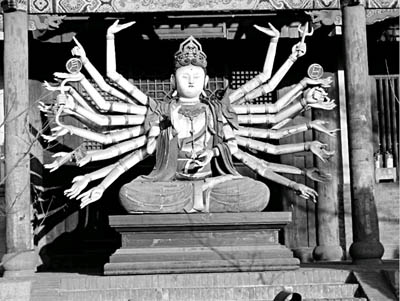 菩萨殿正中有一尊千手千眼观音像,这尊观音有26只手臂,每只手姿态不同,且持有不同的法器,有轮、伞、花,有刀、剑、戟等。