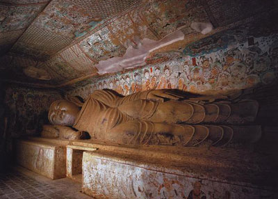 其次,我们感到这个大佛心灵的宁静,他安安静静地睡着了。不管人世间有什么烦恼的事,都不能打扰他。他自己没有任何烦恼的事情,睡得那么恬适,那么平静,甚至没有噩梦。这个佛,就是释迦牟尼。其次,要明白,他不是在睡觉,而是“涅槃”了。所谓涅槃,不是死,是解脱了人世间的束缚,进入了不生不灭的境界。涅槃是佛教的最高境界。