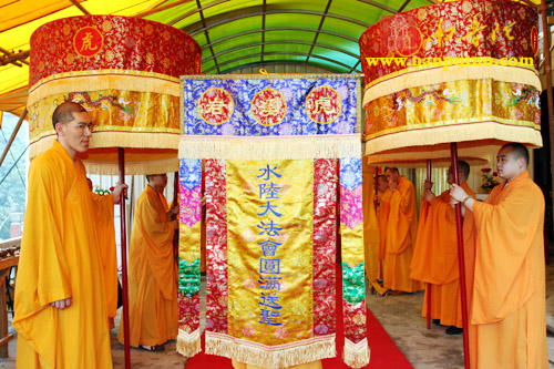 七天的水陆法会之中,法师们不辞辛劳,为众祈福;居士们发心成就,积功累德。众志成城,终得曙光朗照,转劳苦成醍醐;蠢动含灵,值此际会,普仗良缘,均沾法益。