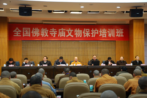为了进一步配合全国第三次文物普查工作,贯彻十七大报告提出的“加强对各民族文化的挖掘和保护,重视文物和非物质文化遗产保护”要求,提高寺庙佛教文物的保护水平,国家宗教局、中国佛教协会和国家文物局三家于2008年3月20日至25日在国家宗教局培训中心联合举办“全国佛教寺庙文物保护培训班”。此次参加培训的学员有200人,均是来自全国30个省市三大语系的重点寺院及有较大影响的寺院的住持或监院以及各省、自治区、直辖市宗教局主管佛教工作的处长。国家宗教局、国家文物局和中国佛教协会对举办这个培训班都非常重视。我局齐晓飞副局长、国家文物局董保华副局长、中国佛教协会一诚会长都出席了开班典礼,并做重要讲话。在接下来的几天,学员们还将系统学习有关文物保护方面的相关知识,并参观“盛世和光—敦煌艺术大展”和故宫博物院等。