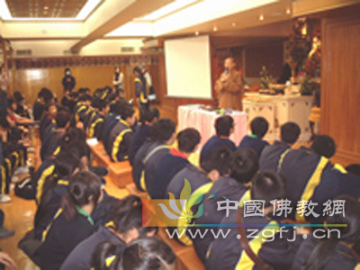 除此之外,透过讲堂资深义工邓永明、锺惠珍等为学生导览讲堂各软硬件之功能,让学生了解都市寺院之弘法状况。最后住持满莲法师以三好 -「说好话、做好事、存好心」勉励众人,同时鼓励同学在心灵及生活上推行环保行动,共同为地球之净化、未来生活的幸福努力。