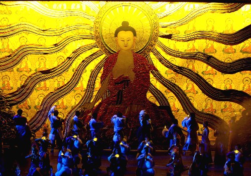 随着西藏旅游业的不断发展,展示西藏风土人情的舞台表演成为最受游客欢迎的节目,同时也给西藏传统歌舞提供了巨大的平台。图为在投资近两千万元打造的西藏首部原生态常态歌舞诗《幸福在路上》中,演员们在表演《雪顿展佛》(2007年8月7日摄)。 中央人民政府和西藏自治区人民政府一贯重视藏民族文化艺术的继承和发展。近50年来,西藏藏语文教学,传统音乐、舞蹈、民间故事以及古籍、档案的挖掘整理等出现了百花齐放、百花争艳的景象。同时,西藏自治区及各地、市成立了民族文化遗产抢救、整理和研究机构,展开了历史上规模空前的抢救、搜集、整理、研究、编辑、出版民族民间文学艺术遗产的工作。经过几十年来大规模地对西藏文化进行发掘、抢救和整理,西藏的文化得到切实的发扬光大,西藏文化从来没有像今天这样灿烂、繁荣。