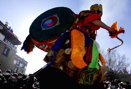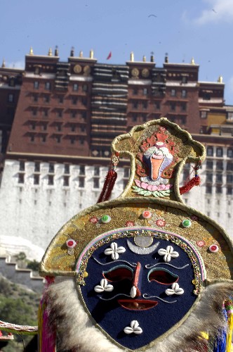 为了保护西藏传统文化,在过去20多年里,国家先后投入了超过7亿元的资金,维修并开放了包括布达拉宫在内的重要古文物建筑和寺庙1400多处。从今年开始,国家还将投入5.7亿元对西藏22处历史文物建筑进行维修,这是中央政府在西藏实施的一次性投入最多、规模最大的文物维修工程。图为一名僧人在表演跳神