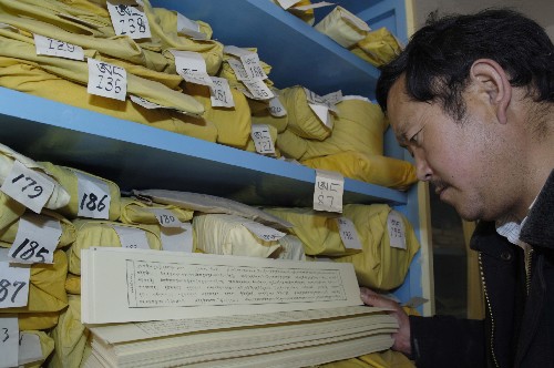 西藏社会科学院藏文古籍出版社的藏族学者次旦在整理古籍(2008年3月26日摄)。1990年以后,藏文《中华大藏经·丹珠尔》(对勘本)、《藏汉对照西藏大藏经总目录》等陆续整理出版,已经印制出版《甘珠尔》大藏经1490部,还印行藏传佛教的仪轨、传记、论著等经典的单行本供给寺庙,以满足僧尼和信教群众的学修需求。