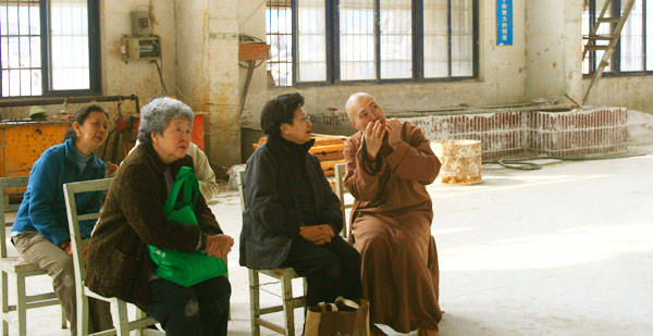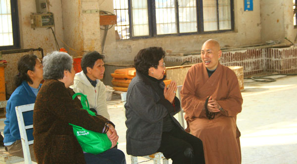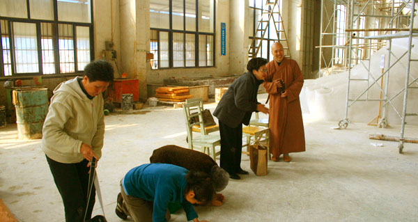 因大安法师正在南昌的大佛铸造厂里监理大佛的放样铸造工作,几位居士不顾长途飞行的劳顿,从飞机场直接赶往铸造车间参拜大佛与法师。在满布尘土的车间里,大安法师非常高兴的接见了这几位远道而来的贵客,并现场向大家介绍了大佛放样工作的进展情况以及此次修改的具体细节,大家都对法师为铸造精品大佛所投入的巨大热诚以及精益求精的工作态度表示由衷的赞叹!
