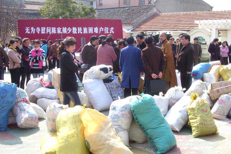 上海崇明县无为寺在陈家镇举行为贫困少数民族捐赠帮困物资仪式。这是崇明县宗教界响应县民宗办号召,首次在民族宗教系统内举行的一次帮困活动。这次捐赠物资主要为衣物等生活用品,总数达4000多件。崇明县委统战部副部长、县民宗办主任郭耀东,县民宗办副主任倪卫东,县民政局、陈家镇党委有关同志参加捐赠仪式。陈家镇地区150余名少数民族群众出席捐赠仪式。