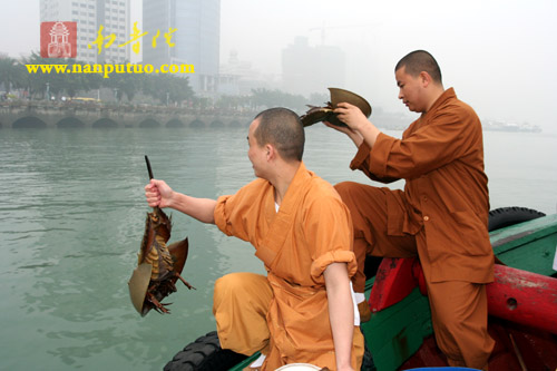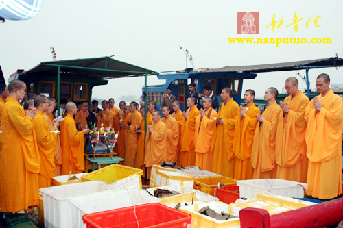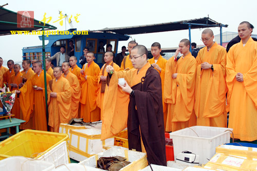 “放生”体现的是佛教众生平等、慈悲救济的精神。为了让放生活动及时顺利地进行,凌晨4时多,一部分学僧和法师就开始了准备工作。7时整,界象法师率众为现场的鱼、贝、螺、蟹类等水族皈依说法、洒净加持,回向发愿,希望它们从此脱离异类身,转生善道,得闻佛法,得大解脱。