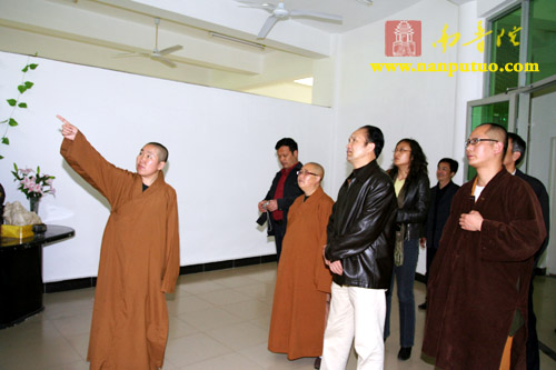 闽院副教务长法源法师为来宾介绍紫竹林寺布局