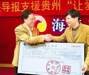 3月10日,贵州省代表接过一张21.3261万元的电汇单,随后,这笔钱从《海峡导报》的爱心账号“出发”,汇往贵州省都匀市,支援当地人民重建家园。该日下午3时,《海峡导报》与贵州省驻厦办联合发起的“让爱传递,重建家园”爱心大行动的捐款仪式,在《海峡导报》举行。爱心行动从2月22日启动以来,至3月6日,14天时间共募捐得爱心款项21.3261万元。