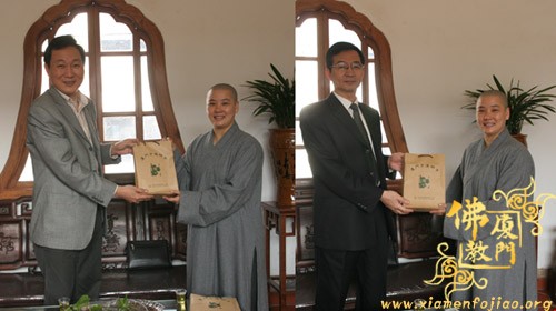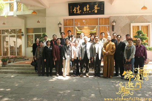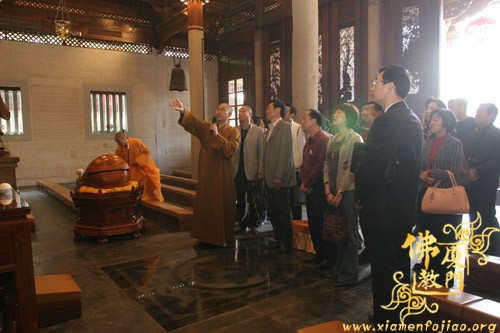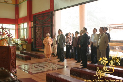10点30分,在南普陀寺受到方丈则悟大和尚、知客法尊法师的热情接待,参观了南普陀寺的大雄宝殿、大悲殿、藏经阁、法堂等处,参观中法尊法师向区领导介绍了南普陀寺的历史沿革,大雄宝殿的修建及建筑特色,藏经阁所藏的法宝文物,令来访者赞不绝口。