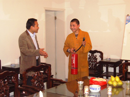 觉海寺僧人现场演示灭火器使用方法