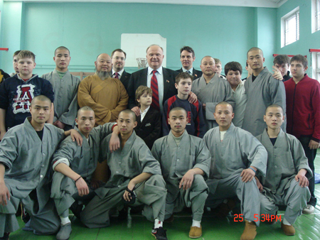 2月25日少林寺的法师们在阿列哈夫学校练功房,为俄罗斯独立台、国家一台等几家大型电视台及卫国战争老战士等俄罗斯共产党的支持者,进行的少林功夫展示,并和久加诺夫等领导人合影。