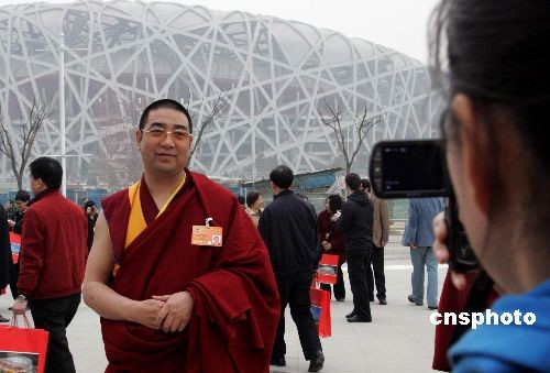 三月十二日下午,部分全国政协委员参观北京奥运场馆。图为全国政协委员、青海省佛教协会副会长拉茂赛赤活佛,在北京奥运会国家体育场“鸟巢”前请人拍照留影。