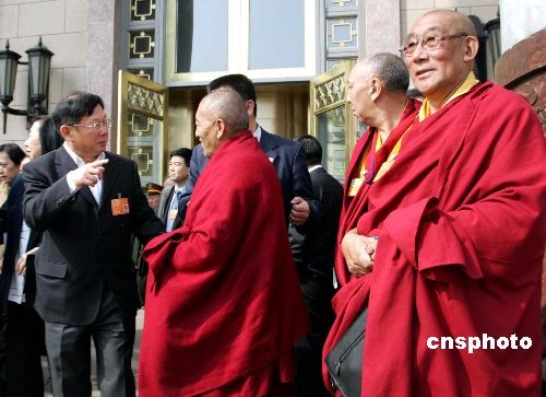 三月十四日,全国政协十一届一次会议在北京人民大会堂闭幕,汉族政协委员与来自西藏的宗教界委员在大会堂门前话别。