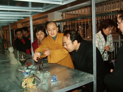程副局长一行在华岩寺方丈道坚法师的陪同下,考察了寺内的文物保存、博物馆的建馆场地等情况后,大家进行了座谈。程副局长表示对于重庆佛教博物馆的筹建相当支持,因为就目前的情况来说,以佛教文化为主题的博物馆,在全国范围内也应该属于首开先河,它展示得更多的,应该是一种文化和一种人文精神,这是对非物质文化遗产的保护,文广局会尽快组织专家鉴定组来寺对文物进行鉴定和建档工作。对于道坚法师对传统文化的重视和保护,程副局长表示了高度的赞扬。