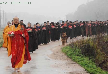 当天清晨,在宝林禅寺住持悟演法师的带领下,僧俗二众打着赤脚,口诵佛号,冒着小雨,走在泥泞的乡间小路上。一张张陌生的脸庞,一只只往钵里塞供养物的手,不一会儿,钵里就装满了馒头、面包、饮料、苹果、香蕉、钱币、日常用品等供养物。大家仿佛回到了佛陀云游四方、沿途托钵的修行时代,真正感受到传统佛教的真谛。