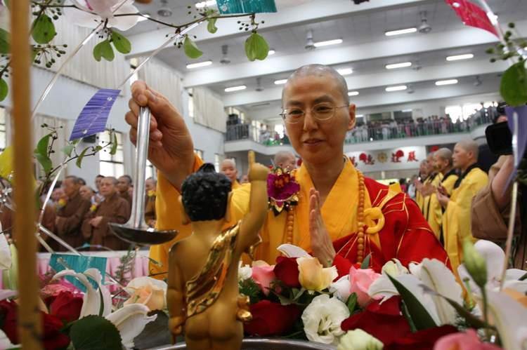 在清净悠扬的浴佛偈梵乐中,主坛法师于浴佛亭前,掬起一杓杓的甘露香汤灌沐佛身,一愿世界和平、风调雨顺、国泰民安!再愿国运昌隆、经济稳定、社会祥和!三愿佛光普照、法轮常转、法水长流!随后,由长官贵宾、僧信大德心怀感念佛陀慈心无尽的恩德,依序来到浴佛亭前浴佛,祈愿浴佛浴心,外离身垢,内离心染。