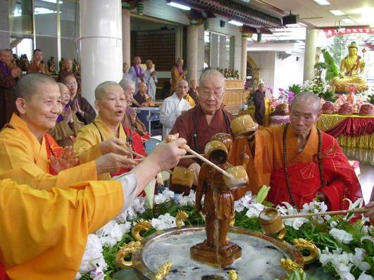 浴佛法会邀请惟励长老、会等、惟定、达性、上定、觉空、地靖等长老尼共同主坛,举行佛前大供后,惟励长老与台湾中国佛教会理事长净良长老带领与会僧信于九龙浴盆前,以诚敬之心,沐浴释迦太子像,共为两岸人民祈安乐。现场百余僧信俱生无量法喜之乐,人人肃敬,井然有序地排队浴佛,两旁并有护法信众组成之园游摊位。
