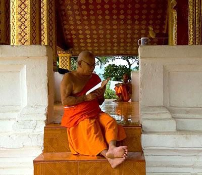 寺庙里的僧人还可以接受寺外的世俗教育。我在老挝人民革命青年团中央办的英语培训班里就见到了一个正在补习英文的年轻僧人。另外,老挝僧人接受新鲜事物的能力也很强。路过万象的一家网吧时,我看到一个僧人正在靠窗的电脑前上网,他的红袈裟非常显眼。