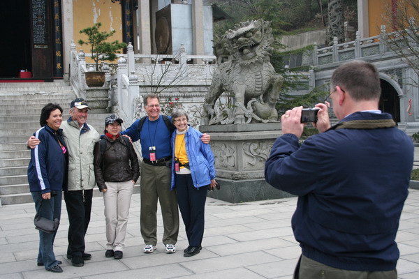 下车后,美国游客看到九华山这样的异国风情显得非常兴奋,纷纷在祇园寺、百岁宫、大悲楼等重点寺庙前拍照、合影。首次来中国的约翰通过九华股份国旅的导游告诉记者:“他是通过朋友的介绍知道中国九华山的,今天能身临九华山感到非常兴奋。中国九华山的佛教文化的确很神奇,建筑也非常有特色。”