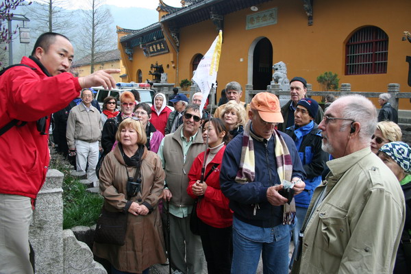 3月31日,120余名美国游客乘坐“维京”号游轮转抵九华山景区,开始了他们为期两天的九华山观光之旅。