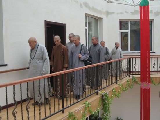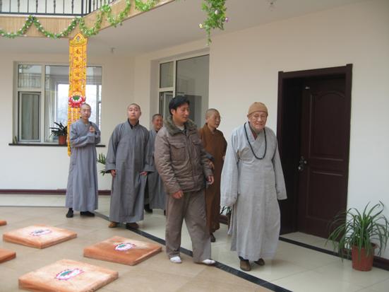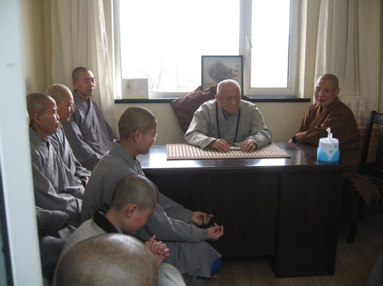老和尚一行人于上午九点多到达园区,参观了妙吉祥村一号楼的大厅和住众的房间。并在弟子们的殷勤乞请下,老和尚为大众作了深入内心的开示。他告诫弟子们清泰园这个地方不同于普寿寺和大乘寺,是行菩萨道的场所,在这里的人一定要有奉献的精神,甚至要为众生献上我们的生命。老和尚说:“在四十年代的时候,四川的某山上有个区域住着麻风病人,那里的医生大多是从国外过来的,他们放弃了家庭、事业、亲人来照顾这些被世人遗弃的病人,那些医生只要进了这个医院,这一生就不能再出去了,就把他们的全部奉献给了这些病人。”菩萨行就是利他行,在我们身边有很多菩萨示现,那些医生不就是很好的写照吗?他们都能够为他人而牺牲自己,我们是出家人,更应该无私的去奉献,象观世音菩萨那样,时时处处想着利益众生,寻声救苦。