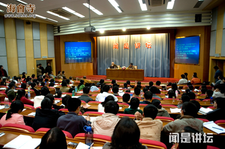 200多人的学术报告厅挤满了听讲的学生、信众。杨教授因机施教,简略概括了佛教的缘起和发展,接着又重点阐述了禅宗在中国的起源及宗派,生动地用公案来进行讲述。