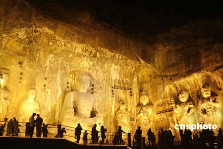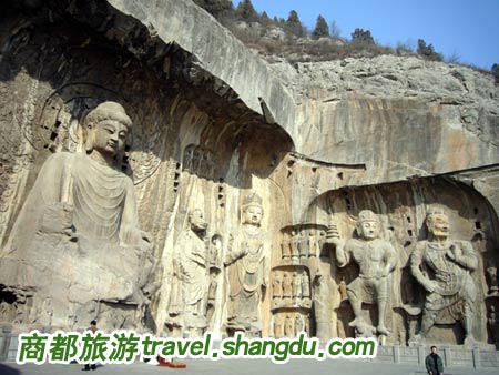 洛阳龙门石窟同敦煌莫高窟、大同云冈石窟并称为中国三大佛教艺术宝库。它位于洛阳市城南十三公里,这里是香山和龙门山两山对峙,伊河水从中穿流而过,远望犹如一座天然的门阙,所以古称“伊阙”。到了隋朝,隋炀帝杨广曾登上洛阳北面的邙山,远远望见了洛阳南面的伊阙,就对他的侍从们说,这不是真龙天子的门户吗?古人为什么不在这里建都?一位大臣献媚的答道,古人非不知,只是在等陛下您呢。隋炀帝听后龙颜大悦,就在洛阳建起了隋朝的东都城,把皇宫的正门正对伊阙,从此,伊阙便被人们的习惯的称为龙门了。